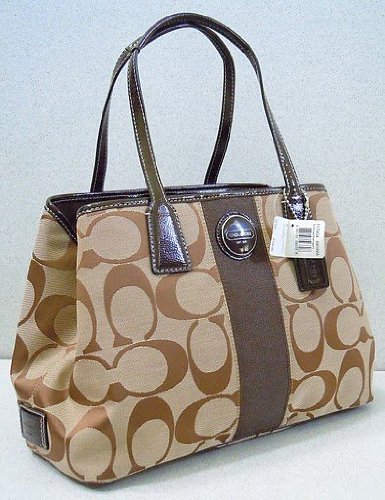 !±8± Coach 17424KM Signature Khaki/Mahogany Stripe Framed Carryall Tote/Handbag 17424